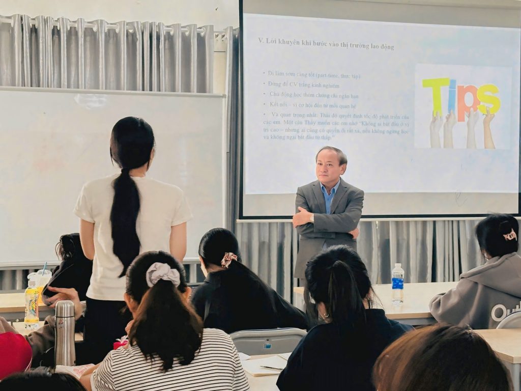 Đặc biệt, chương trình làm nổi bật yêu cầu phát triển năng lực theo hướng tích hợp, nơi ngoại ngữ, tư duy công nghệ và hiểu biết kinh doanh không còn là những mảnh ghép riêng lẻ mà trở thành một hệ năng lực thống nhất. Tiếng Anh được khẳng định như “chìa khóa chiến lược” giúp sinh viên tiếp cận tri thức toàn cầu và khai thác tối đa sức mạnh của các công cụ AI. Cùng với đó, các kỹ năng mềm – từ giao tiếp, làm việc nhóm đến tư duy phản biện và khả năng thích ứng – chính là yếu tố tạo nên sự khác biệt trong môi trường cạnh tranh cao. Đặc biệt, thông điệp về tư duy bền bỉ – dám bắt đầu từ con số 0, kiên trì với những bước đi nhỏ và không ngừng tích lũy – đã để lại nhiều ấn tượng sâu sắc.